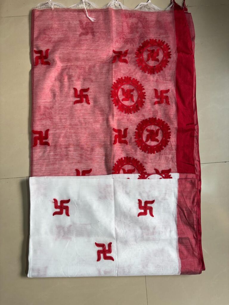 A beautifully handcrafted handloom saree featuring intricate appliqué work, where decorative fabric pieces are skillfully stitched onto the base cloth to create artistic patterns. Known for its unique texture and elegant finish, this saree combines traditional craftsmanship with a contemporary touch — perfect for festive and casual occasions.
