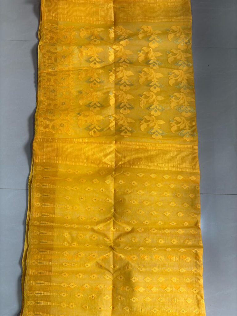 Beautiful Flower Dhakai Yellow saree features delicate floral motifs woven intricately on a soft, lightweight fabric. Its bright yellow hue adds a vibrant and elegant charm, perfect for festive and traditional occasions.