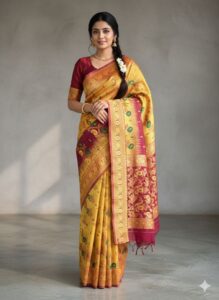 Tussore sarees are made from wild silk known for its natural gold sheen and rich texture. These sarees are lightweight, breathable, and elegant, making them perfect for both festive and formal occasions. Handwoven by skilled artisans, Tussore sarees often feature intricate zari borders, block prints, or hand-painted designs, showcasing a blend of traditional craftsmanship and timeless beauty.