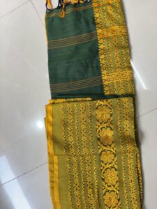 Begampuri is a traditional handwoven cotton fabric from West Bengal, known for its lightweight, soft texture, and distinctive border designs. Made on handlooms by skilled artisans, Begampuri sarees and fabrics are comfortable for daily wear and showcase elegant simplicity with vibrant colors and geometric motifs.