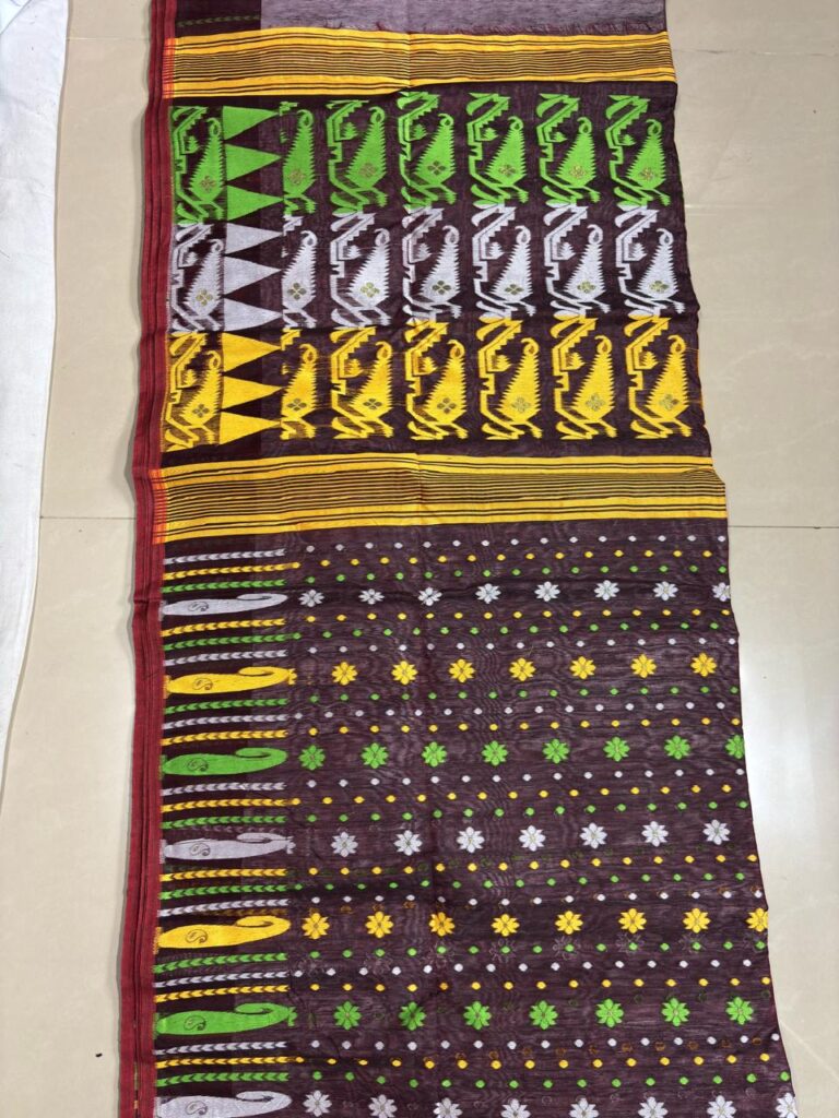 Buti Dhakai Jamdani is a classic Jamdani saree known for its tiny, scattered woven motifs called “butis” spread evenly across the entire fabric. These delicate floral, paisley, or geometric butis give the saree a minimal yet elegant look.