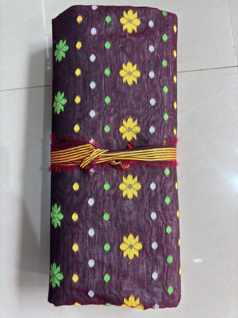 Woven on a fine cotton base, it is lightweight, soft, and breathable, making it ideal for daily traditional wear, pujas, and festive occasions. The simplicity of the buti patterns combined with the sheer texture of the fabric highlights the grace and timeless beauty of this saree.