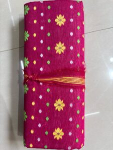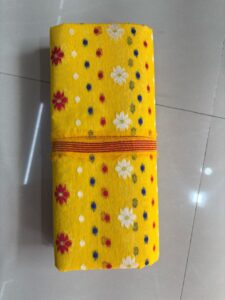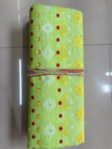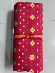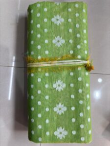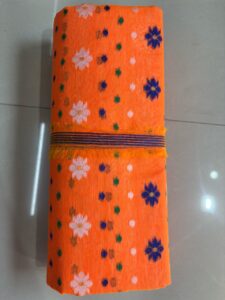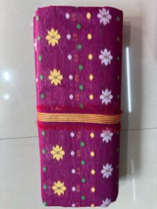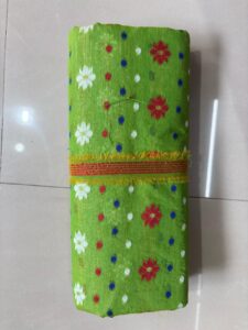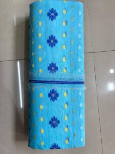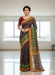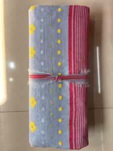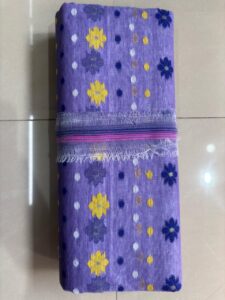 Woven on a fine cotton base, it is lightweight, soft, and breathable, making it ideal for daily traditional wear, pujas, and festive occasions. The simplicity of the buti patterns combined with the sheer texture of the fabric highlights the grace and timeless beauty of this saree.