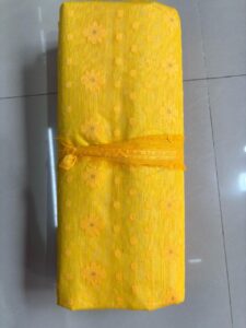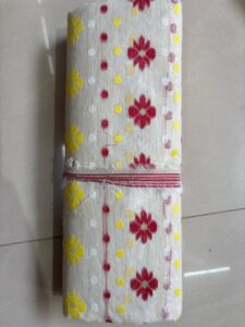 Buti Dhakai Jamdani is a classic Jamdani saree known for its tiny, scattered woven motifs called “butis” spread evenly across the entire fabric. These delicate floral, paisley, or geometric butis give the saree a minimal yet elegant look.