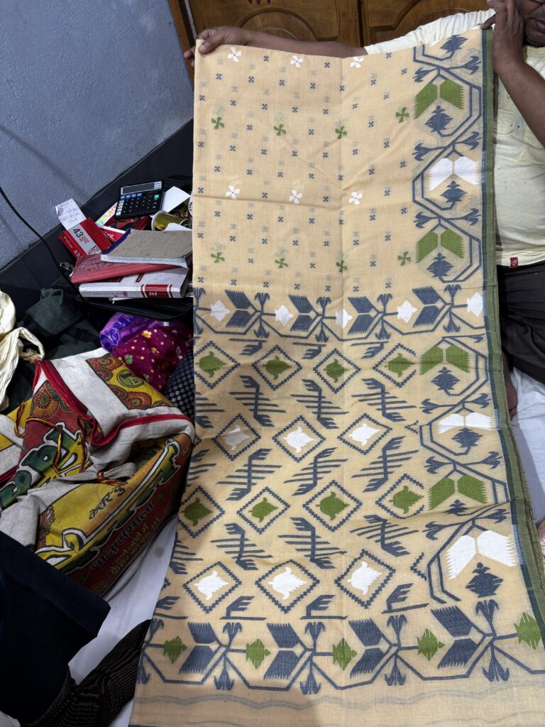 Pure Cotton Jamdani is a classic handwoven saree known for its light, breathable texture and intricate motifs. Crafted with delicate care on traditional looms, it offers elegance and comfort, making it ideal for daily wear as well as festive occasions. Its timeless design and soft feel reflect the rich heritage of Jamdani weaving.